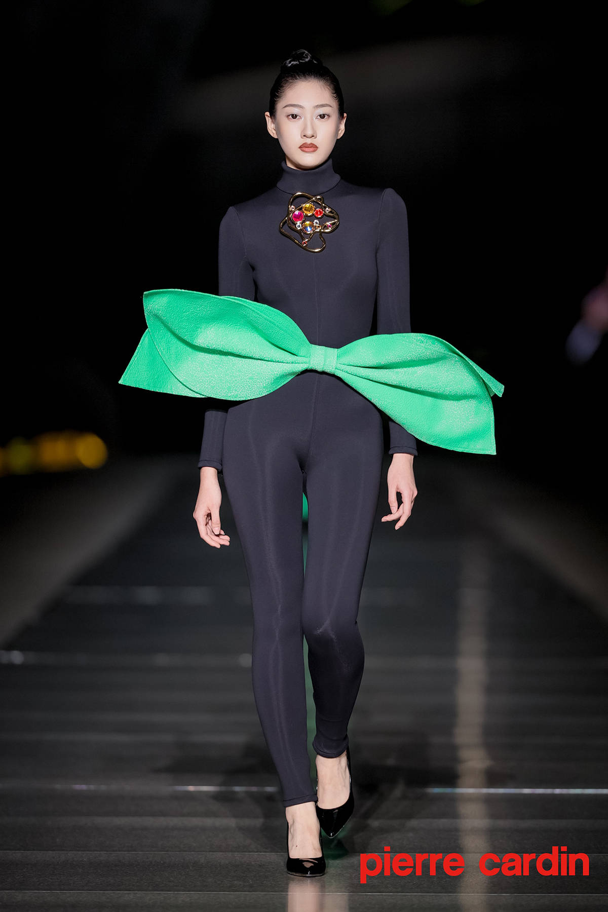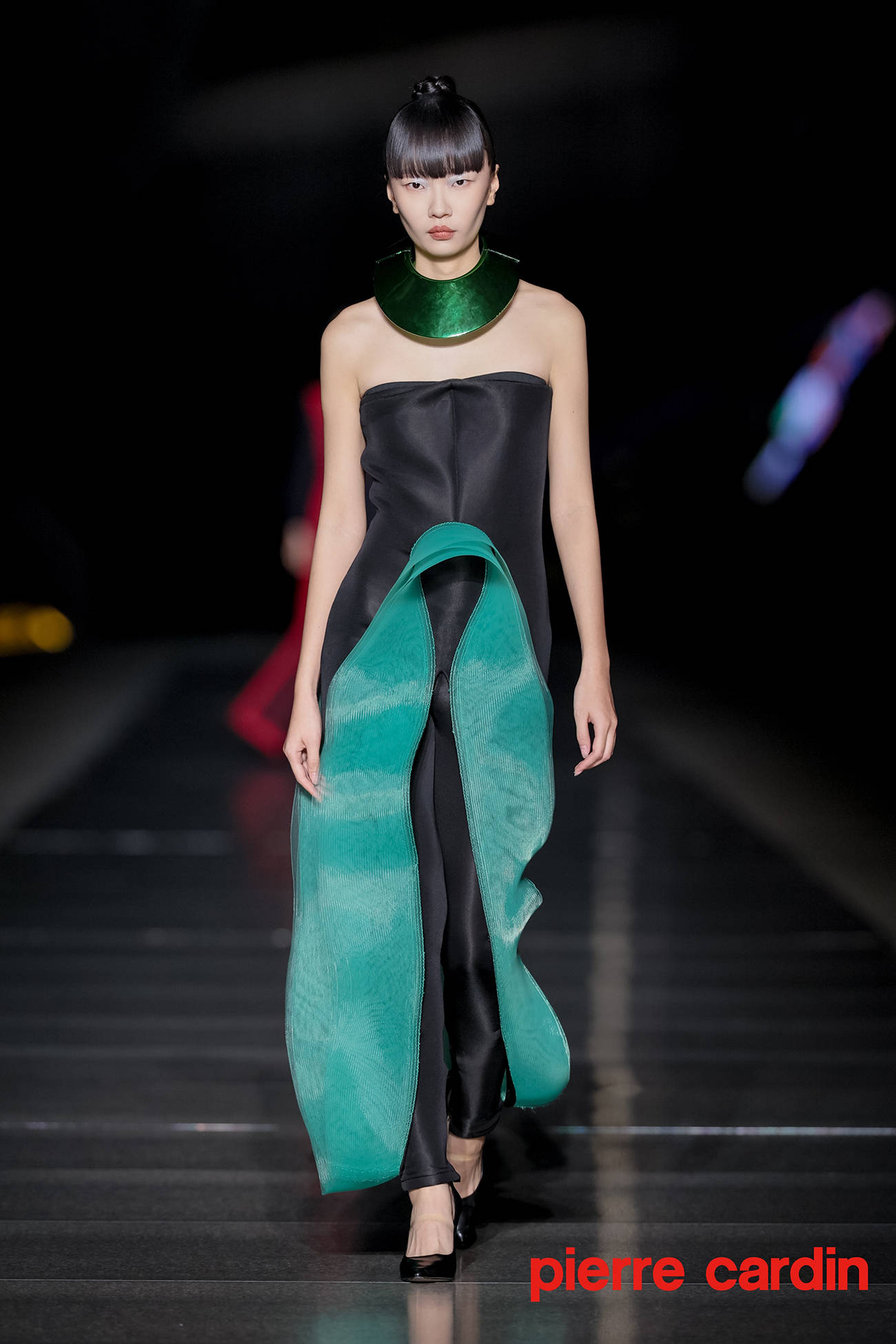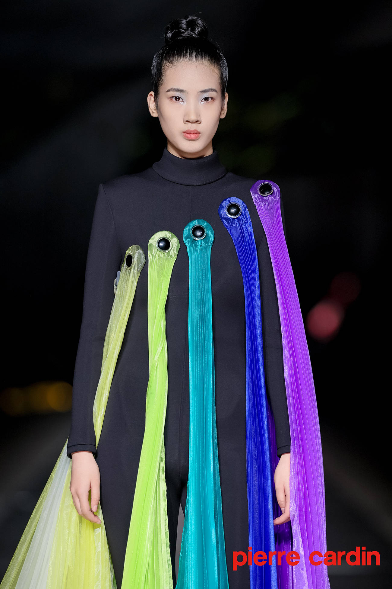 本次发布会摒弃传统封闭空间,特选位于大剧院二层的开放式空中艺阁进行展示。银光T台上,几十位中外名模特串联起一首流动编年史,将皮尔卡丹的经典设计美学生动展现人前。极具科幻气质的高级成衣经由悬浮多面建筑体的衬托,更显异世孤傲的氛围感。